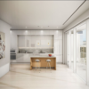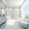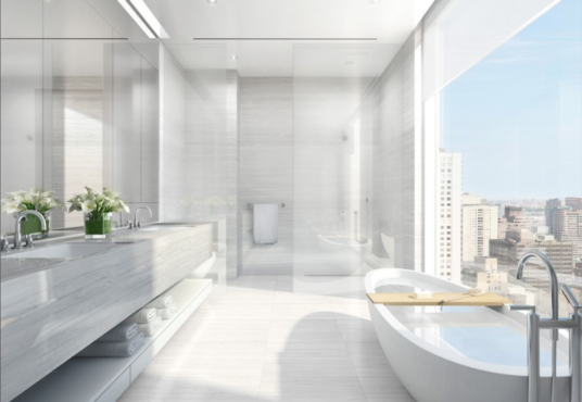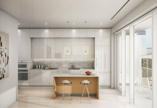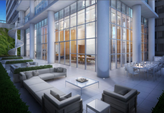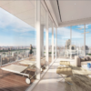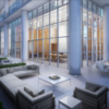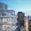 The tower rises to 35 stories and all residences feature deep continuous wraparound terraces, creating a seamless transition between indoor and outdoor living space. Column-free interiors surrounded by floor-to-ceiling walls of glass are finished with white oak plank flooring, white Calacatta, and Siberian white and mink marble. At the base of the tower, metal basketweave cladding reflects natural light through the day and emits a soft glow through the night. Above this podium, double-height amenity spaces open to a landscaped terrace.